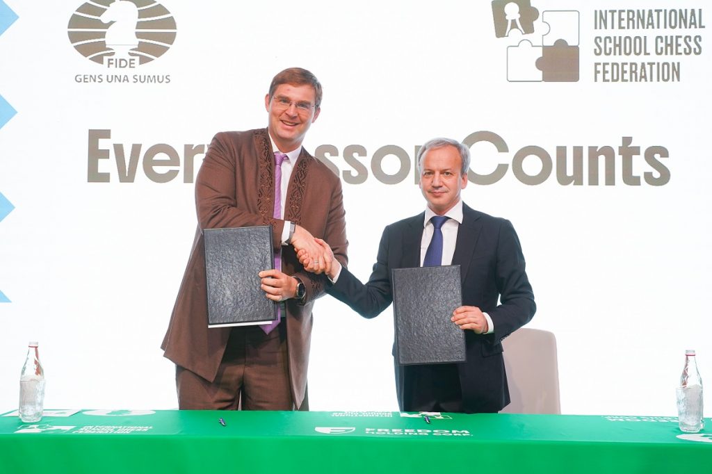 Бүгін Астанада Олимпиада шеңберінде тағы бір маңызды оқиға болды: NGS мектебінде FIDE (Халықаралық шахмат федерациясы) мен ISCF (Халықаралық мектеп шахматы федерациясы) меморандумға қол қойып, 2026 жылды Білім берудегі шахмат жылы деп жариялады. Аталмыш құжат бүкіл әлемде мектеп шахматын дамыту бағытындағы бірлескен күш-жігерді нығайтады. Бұл қадам халықаралық білім беру және инклюзивті бастамаларға негіз болады. Мұндағы мақсат — зияткерлік спортты кеңінен тарату және білім беру құндылықтарын ілгерілету.