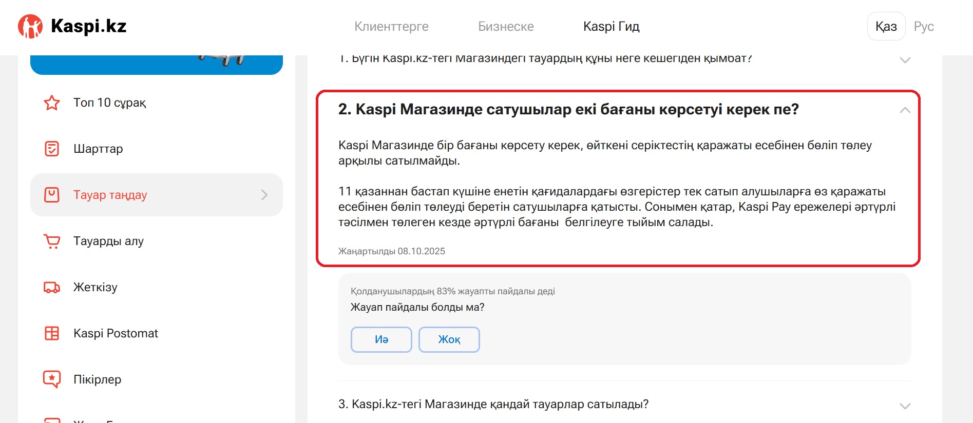 Ал енді Kaspi банк 11 қазаннан бастап күшіне енген бұл жаңа ережелерге бағынбайтынын мәлімдеді. Банктің мәліметінше, Kaspi Дүкен ішіндегі тауарлар бұрынғыдай бір бағамен ғана көрсетіледі.