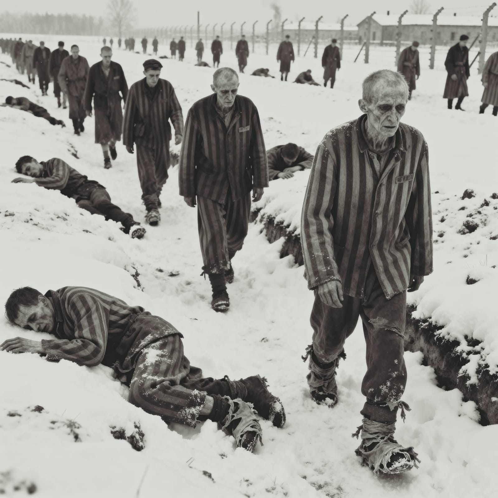 1945 жылдың ақпанында Қызыл армия жақындаған кезде, нацистер лагерьді эвакуациялау туралы бұйрық берді. «Көшіру» деген желеумен 25 мың тұтқын боранды қыс түнінде батысқа қарай айдалды. Бұл – тарихқа «өлім маршы» деген атпен енген сұмдық кезең еді. Адамдар қарлы жолда аштық пен суықтан, соққы мен үмітсіздіктен құлап жатты. Көпшілігінің денесі жол шетінде мұз болып қатты.