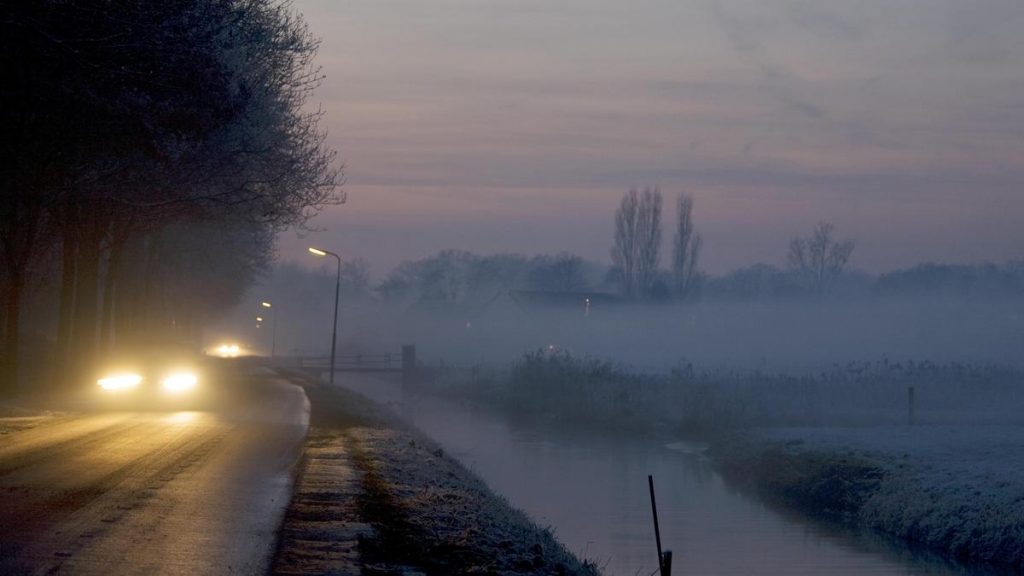 A thick layer of fog is slowly approaching from across the small canal while cars drive by with their headlights on.
