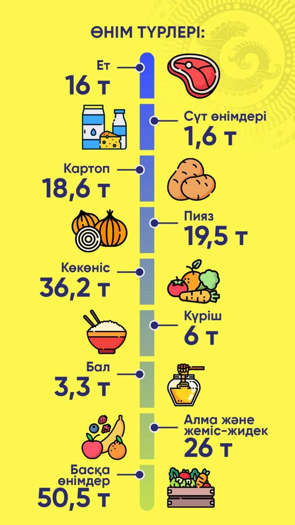 В Алматы будет завезено 16 тонн мяса, 1,6 тонны молочной продукции, 18,6 тонны картофеля, 19,5 тонны лука, 36,2 тонны овощей, 6 тонн риса, 3,3 тонны меда, 26 тонн яблок и фруктов и 50,5 тонны прочей продукции.