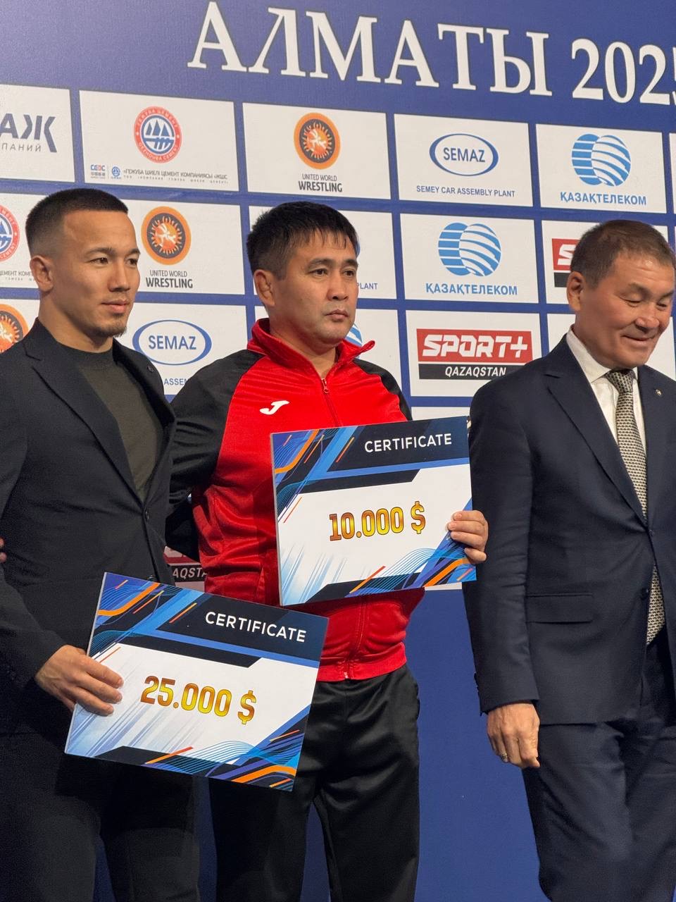А чемпиону мира по греко-римской борьбе 20245 года Айдосу Султангали от Федерации была вручена денежная премия в размере 25 тысяч долларов США. Его личный тренер был удостоен награды в 10 тысяч долларов.